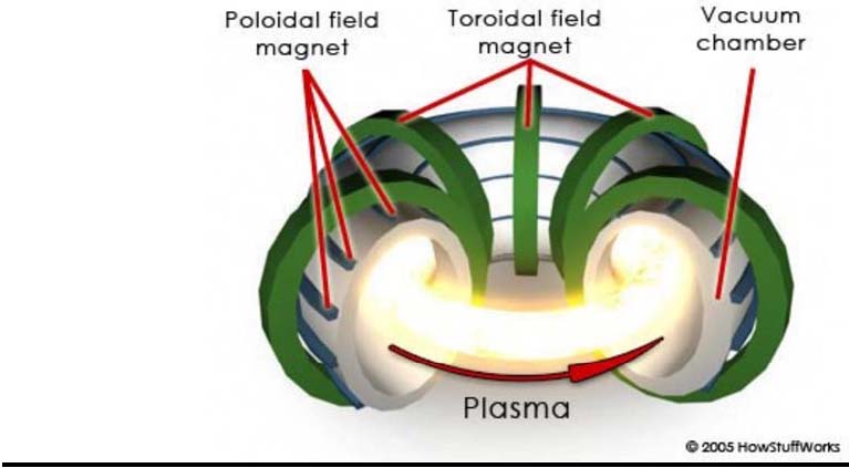 En ITER para lograr la fusión, el reactor requerirá alrededor de 70 Megawatts, pero la potencia entregada por el reactor será de 500 Megawatts. La reacción del reactor durará de 300 a 500 segundos, pero eventualmente se logrará una reacción continua. 2.- La chaqueta de Litio que rodea a la cámara de reacción de plasma absorberá los Neutrones de alta energía generados en la reacción y se calentará por estos Neutrones. 3.- El calor será transferido a un cambiador de calor de agua y se producirá vapor de agua. 4.- El vapor accionará turbinas para producir energía eléctrica. 5.- El vapor condensado en la turbina regresará al cambiador de calor. Inicialmente en el Tokamak de ITER se probará la funcionalidad de una reacción de fusión sostenida y eventualmente será una planta de fusión. |
