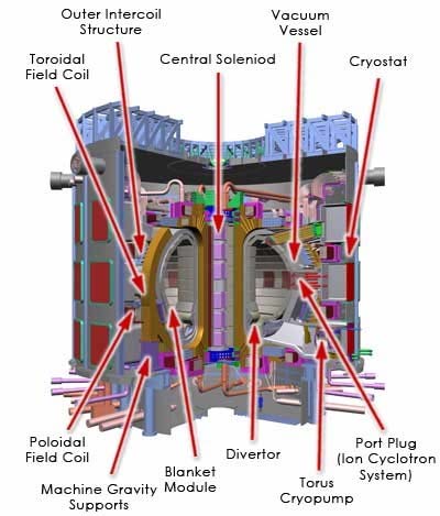 El Tohamak de ITER será un reactor autocontenido cuyas partes podrán quitarse o ponerse sin necesidad de desarmarlo todo para su mantenimiento, tendrá un diámetro interno de 2 metros y externo de 6.2. |